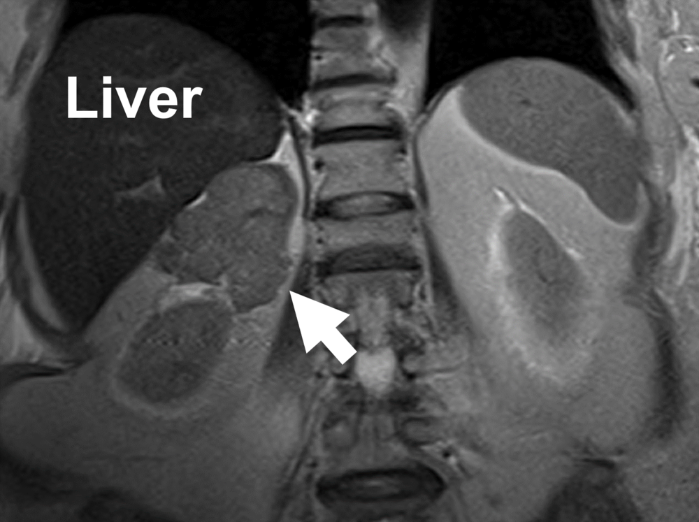 Figure 2. An MRI showing an adrenal cancer (arrow) arising from the right adrenal gland. Note the heterogeneity and irregular borders.