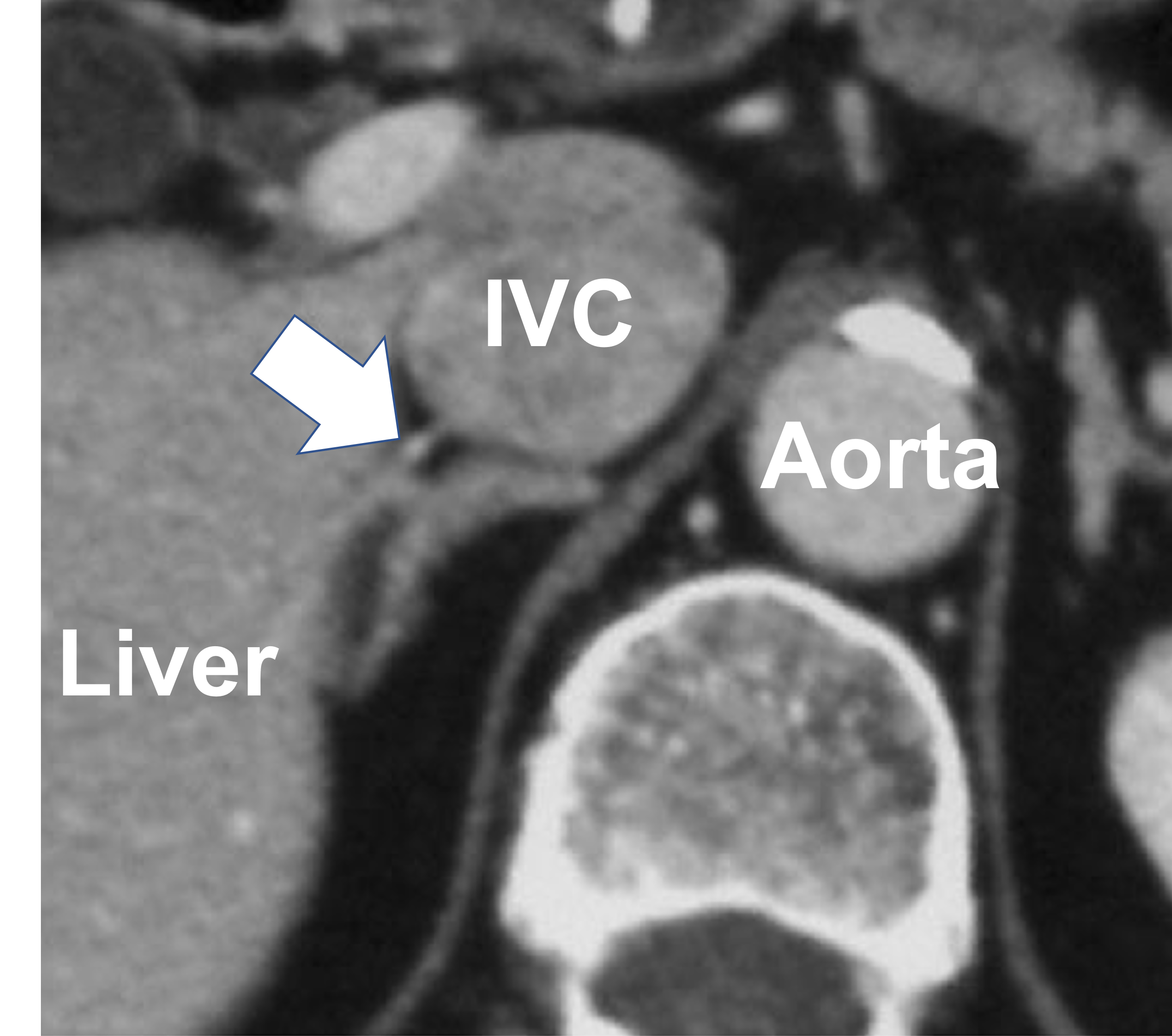 A special pre-procedure adrenal CT scan protocol developed by Dr. Carling and his radiology colleagues clearly identifies the right adrenal vein (arrow) draining into the inferior vena cava (IVC)
